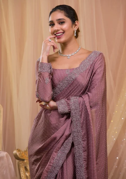 Lavender Colored Shimmer Satin Lace Saree With Unstitched Blouse