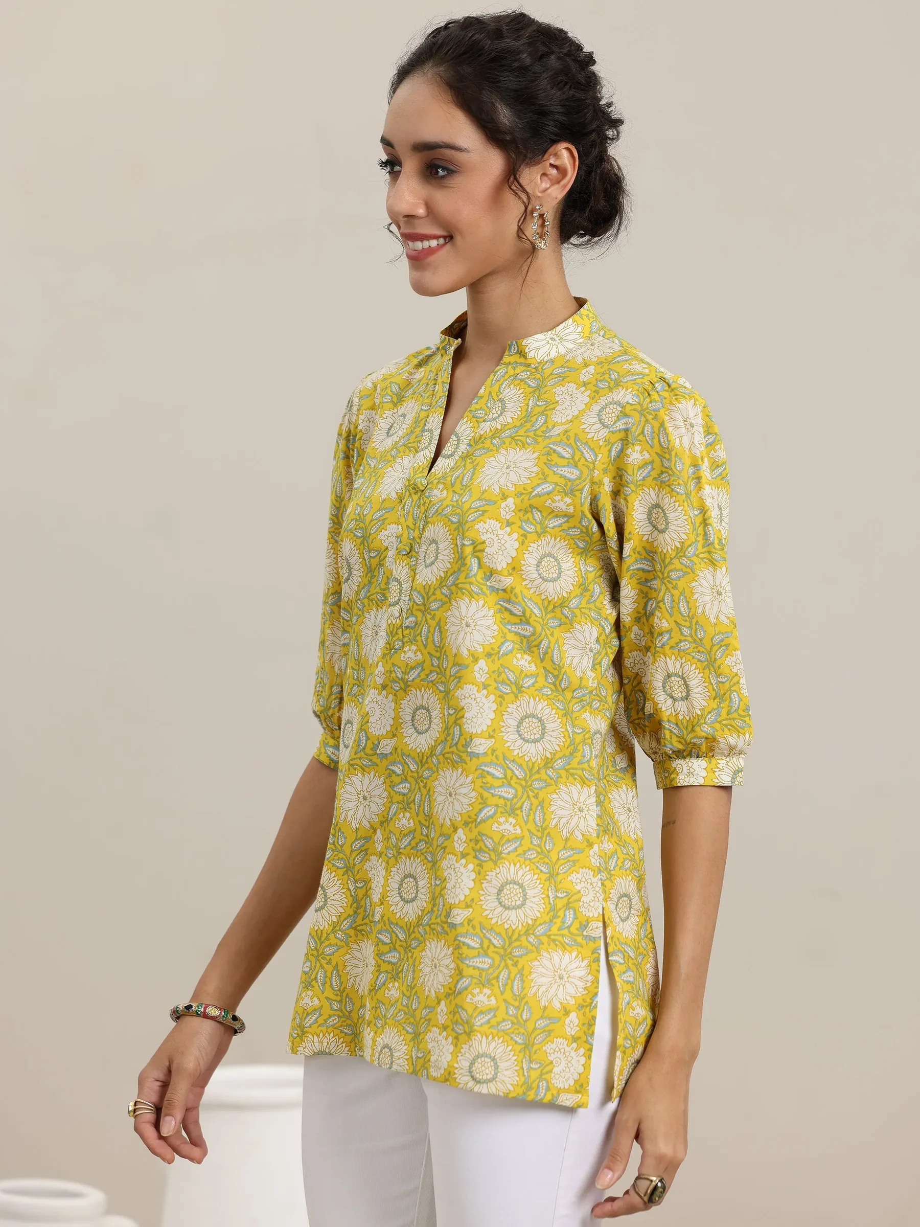 Yellow Printed Cotton Straight Short Kurti